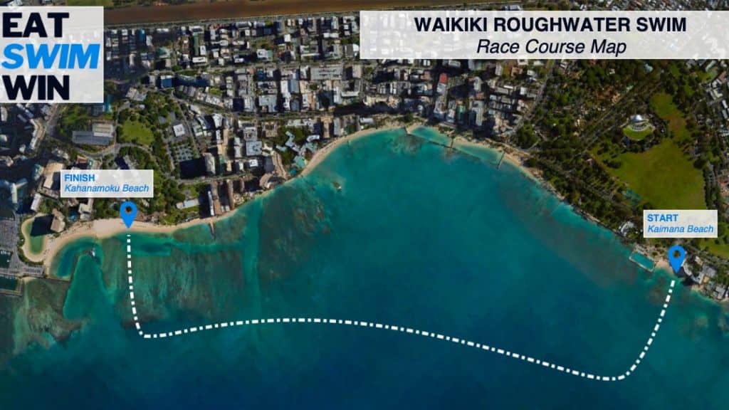 This is a ~4100-yard open-water swimming race that takes place in Honolulu and attracts more than 600 swimmers each year. The race begins in front of the Kaimana Beach Hotel and ends in front of the Hilton Rainbow Tower.
